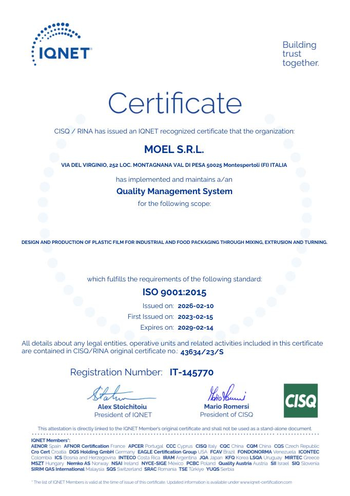 MOEL SRL is 'DESIGN AND MANUFACTURE OF PLASTIC FILMS FOR FOOD AND INDUSTRIAL PACKAGING THROUGH MIXING AND EXTRUSION PROCESSES'